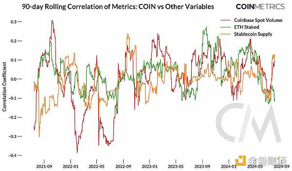 COIN收益與關(guān)鍵指標(biāo)之間的90天滾動相關(guān)性顯示出顯著的變化,反映了Crypto市場和與Coinbase業(yè)務(wù)相關(guān)的指標(biāo)的動態(tài)性質(zhì)。在Coinbase作為一家上市公司的早期階段,COIN收益與交易所的現(xiàn)貨交易量呈現(xiàn)出最高的正相關(guān)和負相關(guān)(+0.3至-0.4),表明其對投資者的最初重要性。然而,隨著時間的推移,它與穩(wěn)定幣供應(yīng)和ETH質(zhì)押量變化的關(guān)系也變得越來越突出,盡管這種關(guān)系仍然很弱,這表明投資者的注意力正在逐漸轉(zhuǎn)向新的收入來源。$COIN與市場回報之間的相關(guān)性