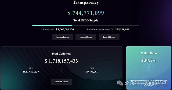USDD的透明度頁(yè)面目前顯示超過7.44億美元的流通量。該穩(wěn)定幣的透明度頁(yè)面列出了其儲(chǔ)備中價(jià)值17億美元的TRX和USDT,其抵押率超過230%。