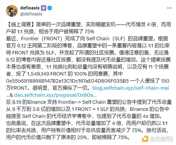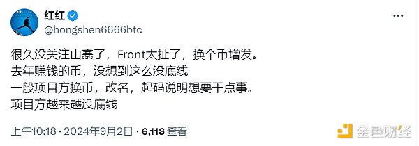 在幣安正式將FRONT更名并上線SLF后,KOL@bitcoin136發(fā)長文表示由于幣安未能在8月19日FRONT更名的公告中明確提及該Tokens會有增發(fā)行為,導(dǎo)致其提前買入而遭受到了資金方面的損失。