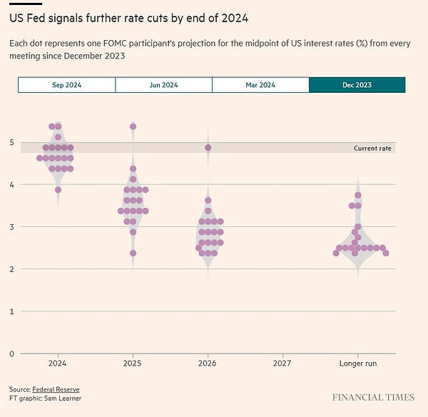 美聯(lián)儲官員們也明確表示他們不會止步于此,周三公布的所謂點陣圖預(yù)測顯示,聯(lián)邦公開市場委員會(FOMC)的大多數(shù)成員估計今年政策利率將再下降半個百分點,隨后在2025年進(jìn)行一系列降息,將利率保持在3.25%至3.5%區(qū)間。