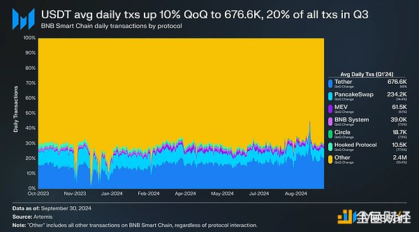 除USDT外,前六大協(xié)議中沒有其他協(xié)議在交易量上實現(xiàn)環(huán)比增長。然而,MEV(環(huán)比增長2%至2%)、BNBSystem(環(huán)比增長1%至1%)和Circle的USDC(環(huán)比增長1%至0.5%)在交易份額上都有所增加。
