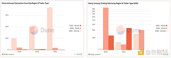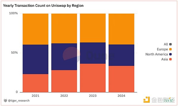這一變化突顯了兩個趨勢。首先,亞洲開發者正在推動Blockchain創新。其次,Blockchain開發正從西方起源擴展到全球。高活躍度的測試網活動反映了積極的實驗,也表明亞洲開發者是Web3未來的關鍵貢獻者。4.3.亞洲零售投資者在去中心化交易平臺(DEX)交易中的參與