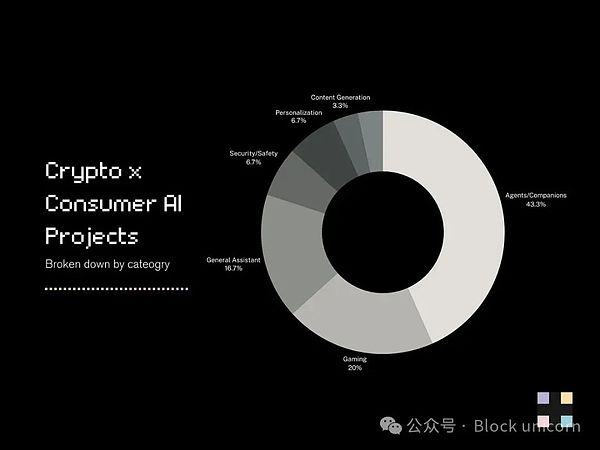 在加密和AI交叉領域運營的以消費者為中心的項目數量仍然相對較少,我們的研究估計約為28個,盡管這并不是一個最終的數字。
