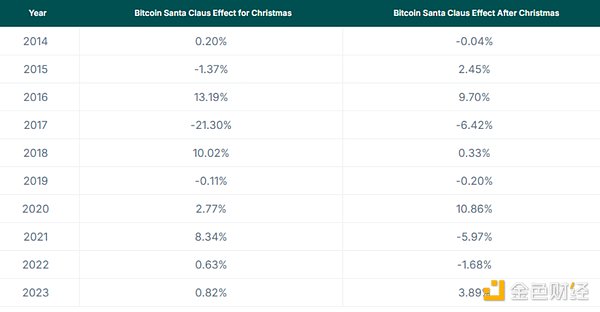 然而,與加密市場的「圣誕老人行情」類似,Bitcoin的「圣誕老人行情」效應(yīng)也表現(xiàn)出不一致的特征。3、過去10年加密市場的「圣誕老人效應(yīng)」