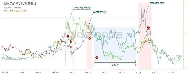 6、在2025年9月-10月還有本輪周期的最后一波行情(如圖中標注6),在這個階段的初期,綠線和藍線出現較大的分離。如果屆時紅線靠近藍線,那么這波行情的高點會比3-4月的峰值更高;如紅線靠近綠線,則高點會低于3-4月的峰值。