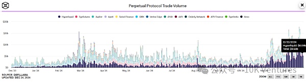 受限于原來鏈上衍生品賽道本身市場規(guī)模較小,得益于Hyperliquid在11月的騰飛,11月dex/cexfuturestradingvolume有了顯著的提升,一己之力將市占率從4%提升至8%。