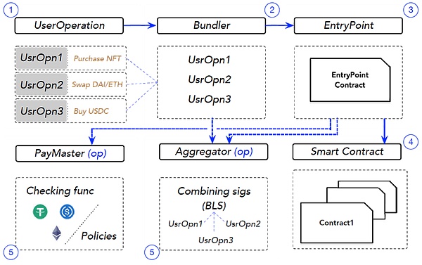 ERC-4337是一個賬戶抽象提案,它在不改變Ethereum核心協議的情況下工作。相反,ERC-4337創建了一個額外的基礎設施層,圍繞替代內存池進行中心化。該層允許智能合約驗證、執行和與UserOperations交互。這些特殊的類似交易的對象使智能合約能夠成為主要賬戶。同時,Bundlers處理它們的收集、聚合和提交到Blockchain。