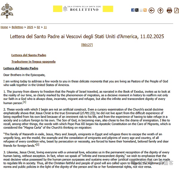 “隨著大規(guī)模驅(qū)逐計(jì)劃的啟動,美國正在發(fā)生的重大危機(jī)。正確形成的良知不可能不作出批判性判斷,不能不對任何默示或明示將某些移民的*非*法身份與犯罪相提并論的措施表示異議。”
