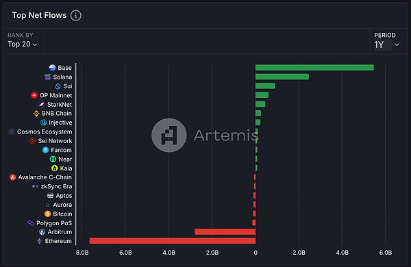 從一年來的資金流動上看,Base、Solana、Sui等協議捕獲了大額流入,而Ethereum則流出將近80億美金。Ethereum生態的交易多集中在Base和Arbitrum上,雖然這符合以Rollup為中心的路線圖的預期,但L1的活動低迷多少會影響到市場對ETH的定價。