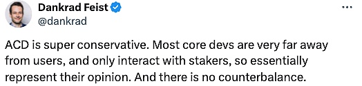 dba聯合創始人JonCharbonneau在去年年末發表了一篇名為《Etherum’sNorthStar》的文章,指出Ethereum缺乏明確的「北極星」目標。Jon在早前的推文也指出,連Ethereum內部也無法就其核心產品達成一致。