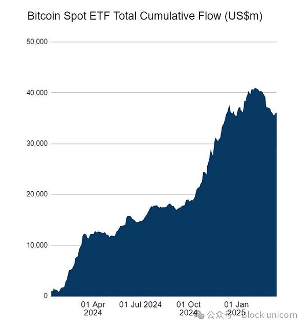 截至2025年初,幾乎所有ETF流動性都流向了Bitcoin,總額達(dá)400億美元,如圖表所示。難怪Ethereum多年來對Bitcoin一直在下跌。大多數(shù)山寨幣也是如此。