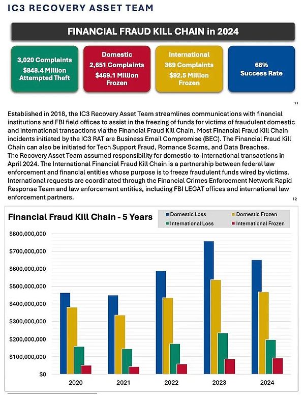 2024年,IC3收到333,981起網絡詐騙投訴,造成137億美元損失,占全年總損失的83%。主要交易方式包括Crypto、電匯、信用卡支付等。
