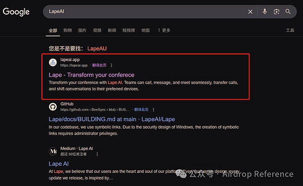 頁面的標題中甚至還出現了明顯的拼寫錯誤:“Transformyour conferece”(正確應為conference)。注意,這個與已經被標記為釣魚網站的LapeAI.app的頁面標題是一樣的。