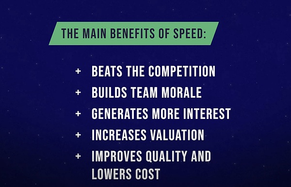 當(dāng)我回顧NFX投資人總結(jié)的所有他們尋找的創(chuàng)業(yè)者和公司特質(zhì)時,我發(fā)現(xiàn)它們最終都匯聚到了一個指標(biāo):速度。無論是優(yōu)秀的溝通能力、對產(chǎn)品的癡迷、面對挫折的韌性、深刻的市場洞察,還是對營銷、銷售、技術(shù)的理解,所有這些讓公司成功的要素最終都體現(xiàn)在速度這一個維度上。當(dāng)NFX投資人看到創(chuàng)始人能夠立即回復(fù)郵件請求,看到他們快速修改演示文稿,看到他們迅速發(fā)布產(chǎn)品,看到他們與客戶快速互動時,這種速度就是他們在尋找的指標(biāo),也是所有想要進(jìn)入創(chuàng)業(yè)生涯的人應(yīng)該關(guān)注的指標(biāo)。