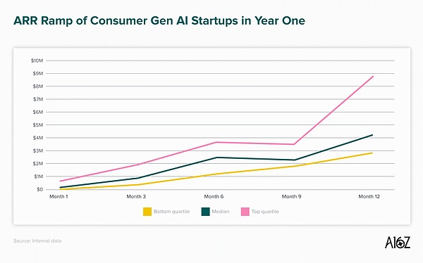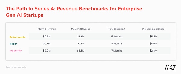 從a16z投資人分析的數(shù)百家公司數(shù)據(jù)來看,我們確實正處在一個新的創(chuàng)業(yè)增長時代。企業(yè)級公司樣本中的中位數(shù)在第一年就達(dá)到了超過200萬美元的年收入,在開始盈利后僅九個月就完成了A輪融資。消費級公司的表現(xiàn)甚至更好,達(dá)到了420萬美元的年收入,并在八個月內(nèi)完成了A輪融資。曾經(jīng)被認(rèn)為是"一流水平"的從零到100萬美元年收入的增長速度,現(xiàn)在處于我們看到的增長的較低端。