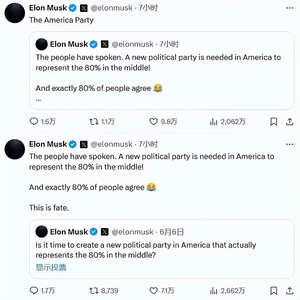 就在雙方“互撕”升級之際,馬斯克在X平臺發起了一場引人注目的投票:“現在是時候在美國建立一個代表80%中間派的新政黨了嗎?”