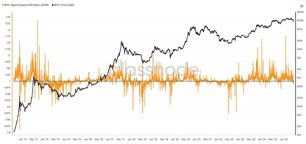 RHODL是衡量短期持幣者(1周)與中長期持幣者(1–2年)之間“已實(shí)現(xiàn)價(jià)值”比值的指標(biāo),用于識別市場頂部風(fēng)險(xiǎn)。歷史上,該指標(biāo)進(jìn)入極高區(qū)域(紅色帶)時(shí),常對應(yīng)牛市泡沫頂點(diǎn)(如2013、2017)。2021-2022年,RHODL再度沖高,雖未突破歷史極值,但提示市場結(jié)構(gòu)進(jìn)入后期。如今該指標(biāo)也進(jìn)入周期性高點(diǎn),在某種程度上也預(yù)示著價(jià)格處于頂部。