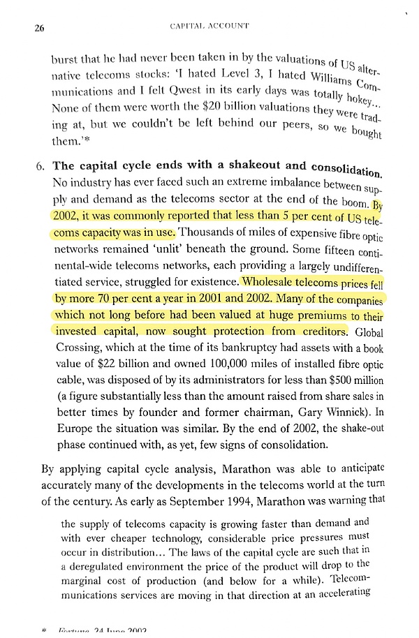 此處引用了書中關于電信行業供應過剩、價格暴跌的內容,提到直到2002年,光纖利用率不足5%