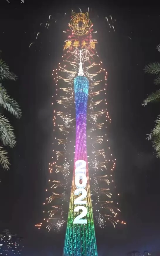 除夕夜,廣州塔打造了虎年新春AR燈光秀,首次實現(xiàn)了與澳門塔隔空“云”上聯(lián)動,以流動的光影和全新的視覺體驗展示了雙塔的夢幻變身,最后煙花綻放出現(xiàn)了恭賀新春的字樣,科技感十足。