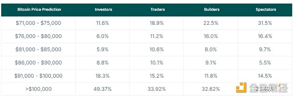 尤其是旁觀者對Bitcoin的期望最低,最高比例為 31.5%,他們預測Bitcoin只會漲到 75,000 美元。