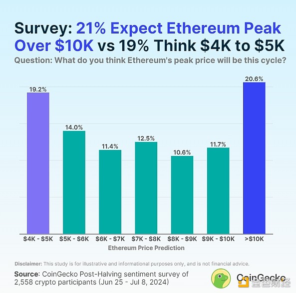 與Bitcoin不同,crypto參與者對Ethereum價格的預期相當復雜。20.6% 的受訪者預測Ethereum將在本輪周期內達到 10,000 美元以上的峰值,這是最受歡迎的觀點,但差距很小。另一方面,19.2% 的人預測Ethereum這次最多只能達到 5,000 美元。