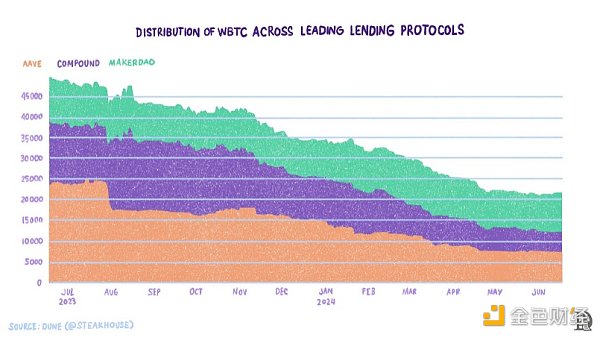 在這種設(shè)計模式下,一個集中的提供商將用戶在Bitcoin上的BTC鎖定在由托管人維護(hù)的Bitcoin地址上。BitGo的WBTC是使用最廣的BTC到其他鏈的橋接方式。使用WBTC橋接的BTC超過150k。WBTC的當(dāng)前分布如下所示。
