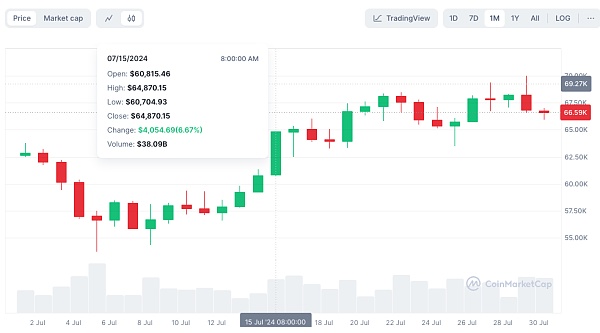 1.7月15日-7月28日,BTC強勢反彈,最高上漲至6.9萬美元(7月27日),收漲12.56%。ETH最高上漲至3543美元(7月22日),7月23日Ethereum現貨ETF正式獲批上市交易后,ETH經歷短暫上漲,然后開始下跌,收于3269美元,收漲2.44%。預期灰度EthereumETF流出壓力相比當時BitcoinETF要小,而整體EthereumETF的規模和增長速度將不及Bitcoin現貨ETF,以至于Ethereum漲幅也會小于當時BTC的表現。BTC現貨ETF上市后,BTC價格2個月后突破歷史新高,漲幅達到62%。